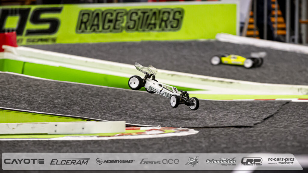 Top qualifier Senne Pauwels (Schumacher) took a dominant win in the first 2WD Stock Buggy A-Main. Pauwels had a clean first lap and was immediately able to pull a gap over the rest of the field. Valentin Peuziat (Xray) and Pelle Culmsee had a nice fight behind Pauwels until Peuziat lost his car in lap seven of the race. Pelle Culmsee moved up to second with his Mugen buggy and Ales Bidovsky was running in third spot.