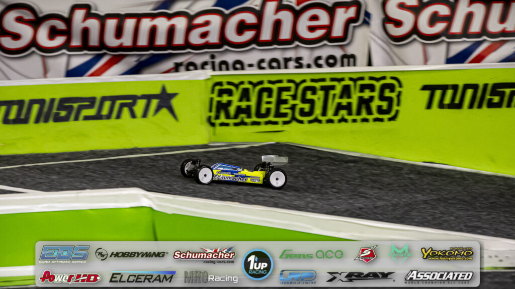 Daniel Hofman was in control of the first final with his Xray XB4C`26 which he managed to win with a massive gap ahead of Yokomo`s Frederik Hovgaard, and the Xray of Sascha Frühwirth. Olivier de Montfumant took fourth place moving up all the way from his eight starting position. Martin Skar and Patrick Müller lost a bit of ground in A1 and had to settle for fifth and sixth place.